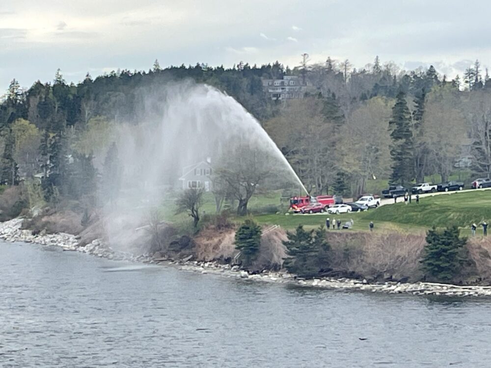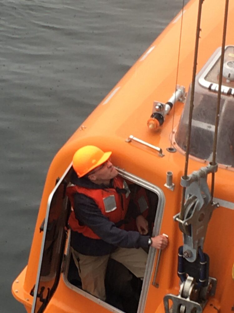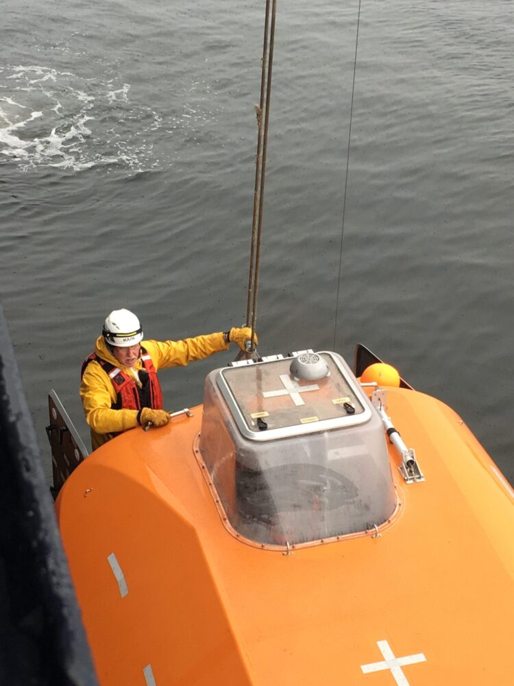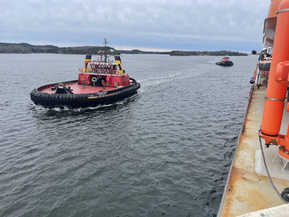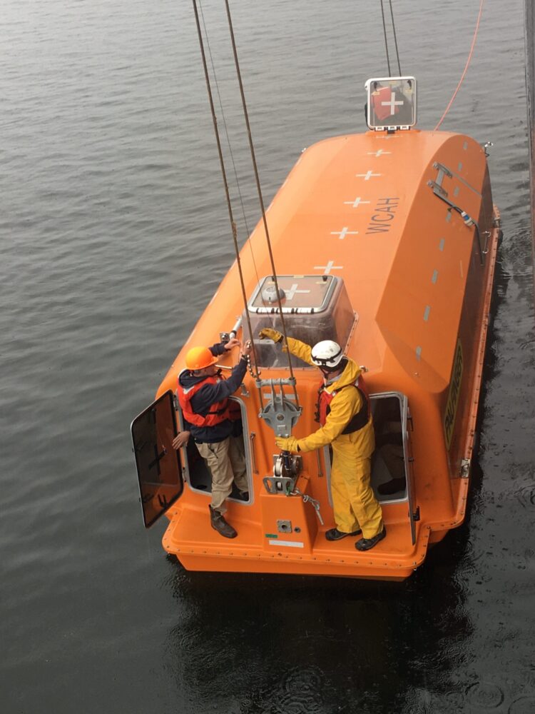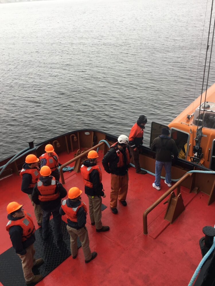 We pulled out of the harbor flying the Hotel flag to signify we had a pilot onboard, and waved one last goodbye to the Castine Fire Department’s siren and hose send-off. Below-decks things quickly returned to normal with lunch, classes, maintenance, and utility projects. Once anchored at Turtle’s Head, Boat Squad was called to start Coast Guard testing and inspections. Lifeboat 2 was lowered with crew aboard and performed some maneuvers before reattaching to the davits and getting hauled back aboard. TSSOM is equipped with four gravity powered lifeboats that can hold a total of 320 people, more than enough for the 248 we currently carry. These lifeboats are designed to go down well but cannot be lifted while loaded, so Boat Squad, the Boson, and Chief Mate were retrieved by our own tug Pentagoet, driven by Captain Derek Chase, and reboarded from the stern. Coast Guard inspections will continue tomorrow, and if all goes well we will depart for New York in the afternoon.