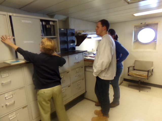 - IBL Joe Maier and Kendra Underhill work with Wanda, the Ship Logistic Officer to take Inventory of the Tech Manuals.