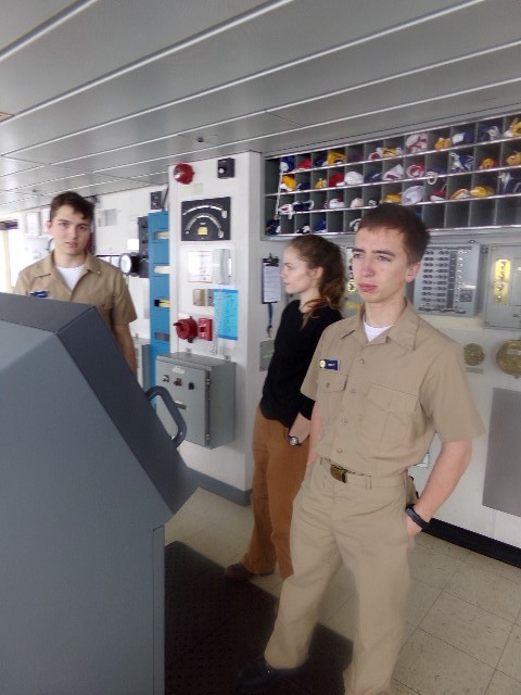 - 2/C Steven Jacoby explains the ship’s steering system to IBL 2/C Tyler Smith and Eleanor Carr.