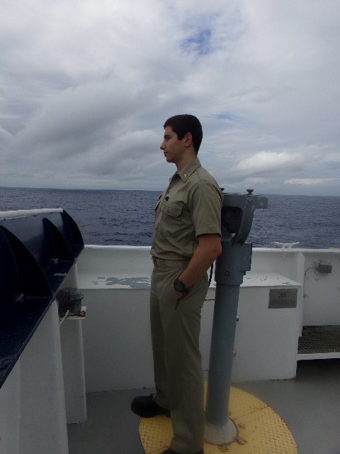- 2/C Chris Randazzo stands lookout on the ship’s starboard bridge wing.