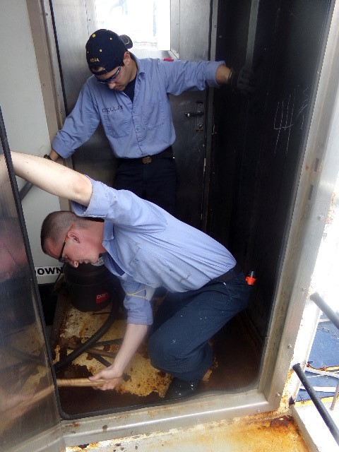- Midshipmen Matt Fendl and Ricardo Cuellar chipping rust off the number two stairwell on the 03 deck.