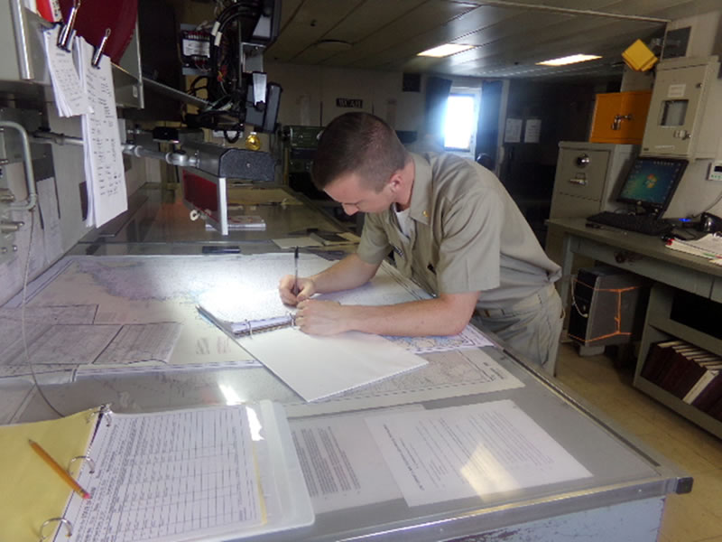 - 2/C Fendl is plotting our position in the chart room to make sure we are staying on course.