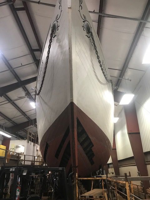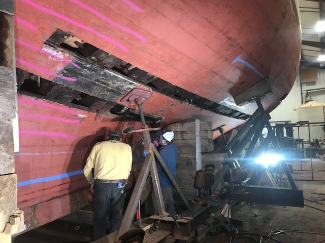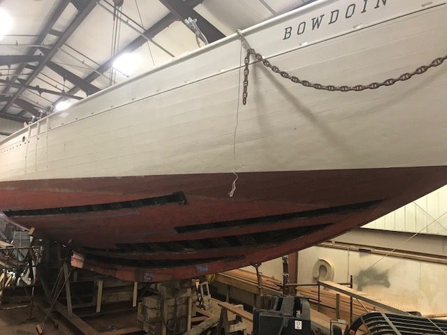 After six days of steady work on Bowdoin, the shipwrights at Boothbay Harbor Shipyard have removed all of the 18 planks identified for replacement in the survey completed at the end of the deck replacement project two years ago. For the most part, we have found the condition of the frames and planking surrounding the removed planks to be in good condition. The fasteners (both trunnels and iron ship nails) are in excellent condition. In general, we have found the vessel in much better condition than expected. This good news is a testament to the fine workmanship of the shipwrights that rebuilt the vessel in the 1980’s and the excellent care the vessel has received under the care of Maine Maritime Academy, Bowdoin‘s previous captains, professional crew, waterfront staff, and countless MMA students and volunteers via the schooner crew.