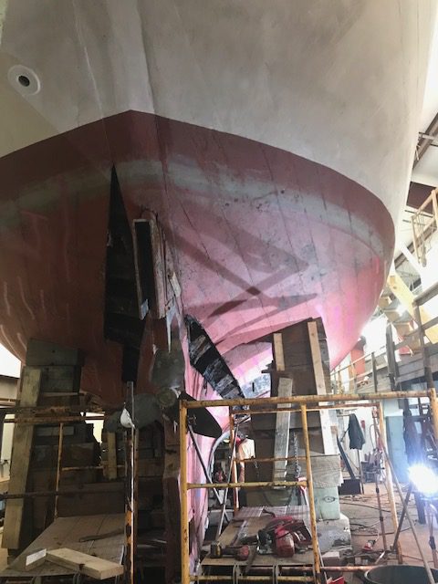 The removal of these planks revealed a total of 10 (out of 78) frames that require further assessment before we can identify the extent to which they will need to be repaired or replaced. The majority of the frames in question are located in the aft cabin region of the vessel (three on the port, three on starboard); the other two are located near the forward head on the port side with the other two located on the starboard side near the region of the refrigerator and freezer areas (where the vessel has seen issues with rot in previous projects). We are currently working to gain access to inspect these frames further and document the condition of the parts of the vessel that we have found to be in good condition. The planks that are being removed have been in place since the early 1980’s with some of them from many years before that. Greater access to these hidden parts of the vessel will allow us to clean out dirt and grime, maintain/improve the concrete ballast, and refresh treatments that will mitigate deterioration for many years to come.