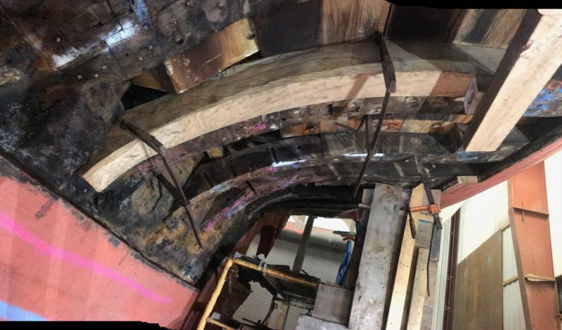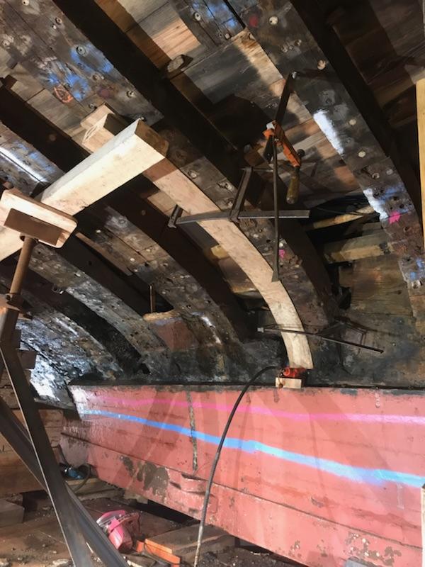 Bowdoin is being put back together this week! Four new frames were installed and many more are cut and ready to go into the vessel next week. The shipyard also received our shipment of Danish white oak that will be used for planking the hull. This white oak was planted around 200 years ago specifically for shipbuilding and is some of the highest quality white oak available. The Ernestina-Morrissey, Massachusetts’ state ship, which is being rebuilt right next to Bowdoin is completely planked with stock from the same source. I will send pictures of the oak in the next update.