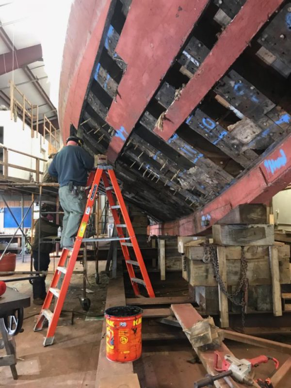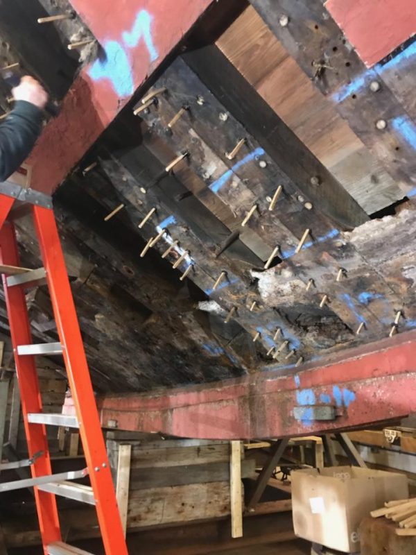 The shipyard recently completed the removal of the last of the 55 planks required for access to the degraded frames found in the ships structure. Once the planks were removed, we worked with the USGC to conduct a thorough assessment of all of the frames and identified frame sections that will need to be replaced or repaired before the ship is put back into service. During the inspection, we identified 29 out of 320 sections that will require some form of refurbishment to return them to ‘like new’ condition. We are working with the shipyard and USCG to create a cost effective plan for each frame section that will return the vessel to optimum operating condition. While we finalize this plan, the shipyard continues work prepping the good frames by placing oak spiles in old fastener holes, stripping the rest of the bottom paint off, and prepping materials for beginning frame replacement and planking.