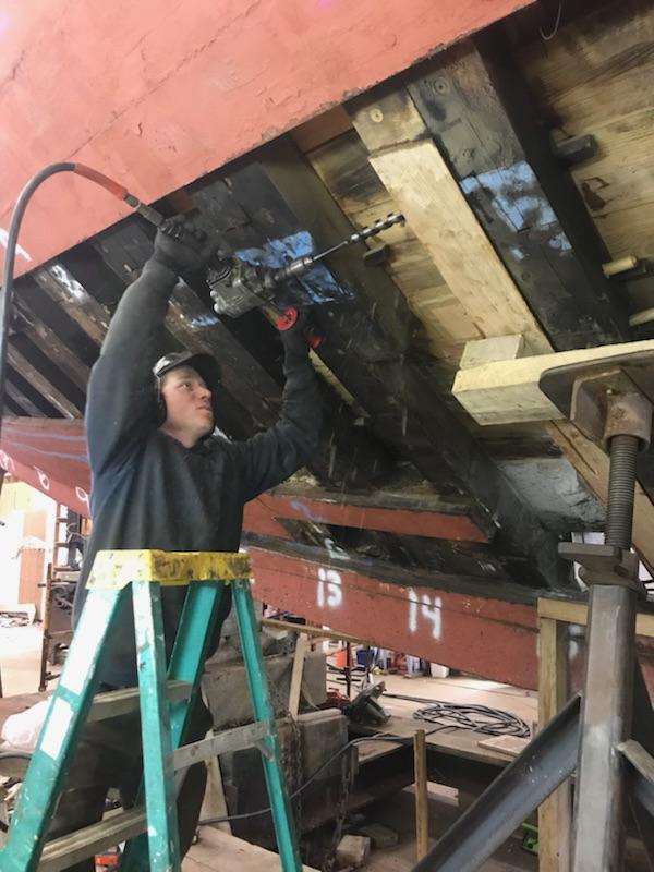 - Alumni Willy Leathers ’11 drills holes for trunnels