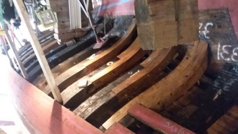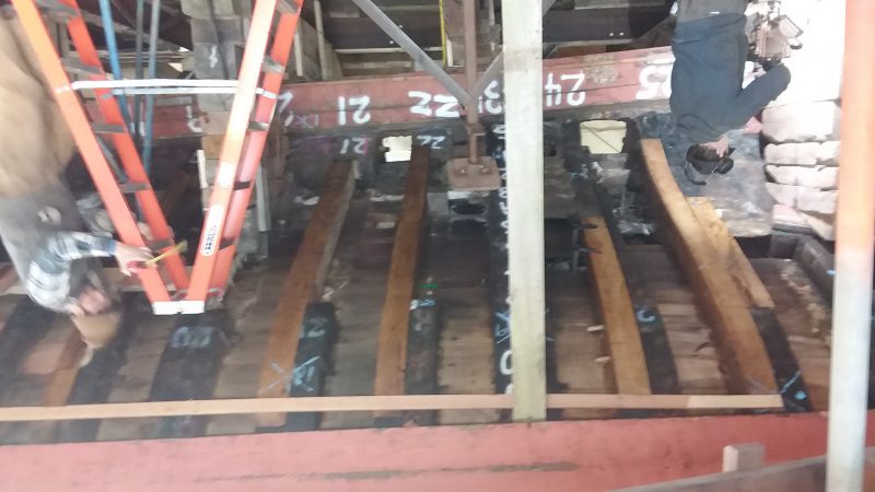 New frame sections are going in quickly and several new planks will be getting cut this week! So far, we have installed 21 new frame sections and now only have to cut and install 21 more. We received a shipment of 10″ white oak slabs from Ohio at the end of last week and we now have all the materials on hand to complete the necessary frame work. As soon as that is done, we’ll get right into planking.