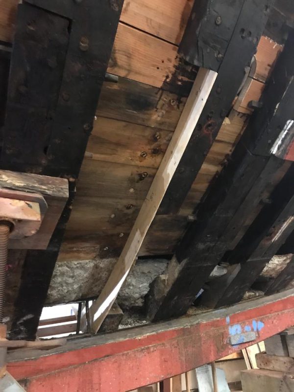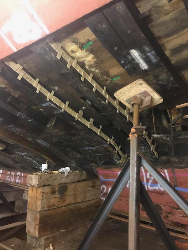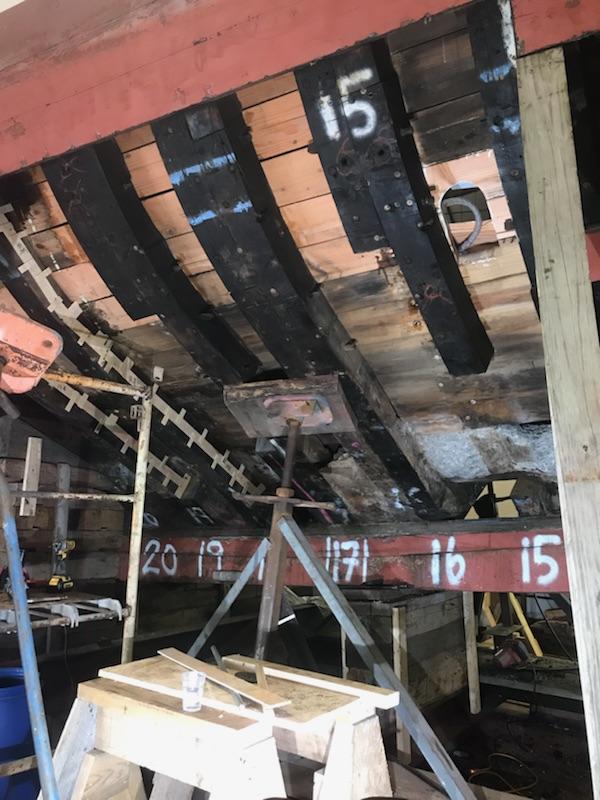 We made great progress this week. Our main focus was meeting with the Coast Guard inspectors to finalize the frame repair and replacement plan. We had a good meeting with our USCG inspectors and came up with a plan to replace 33 Futtock sections and make nine repairs to the frames. The completion of this plan allows the shipwrights to move ahead quickly and get new frames into the ship. Lots of patterns were made of the old Futtock sections this week and the lead shipwright can spend some time this weekend cutting out new frames. MMA grad Willy Leathers ’11 has joined the team working on Bowdoin and Willy was able to make many of the patterns this week. We have reached the zenith of the project’s demolition work and most of our efforts going forward will be put towards reassembling the vessel.